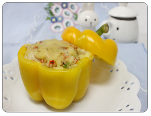 5. 속을 파낸 파프리카에 4번의 볶음밥을 채워 담고 그 위에 모차렐라치즈를 뿌린다.