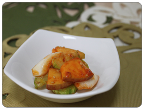 오이 30g, 사과 30g, 당근 20g (양념) 고춧가루 1g, 식초 5g, 설탕 2g, 통깨 약간 |