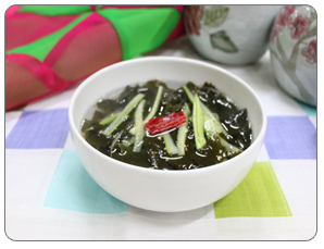 오이 25g, 건미역 3g, 소금 1g, 홍고추 2g, 통깨 약간 (양념장1) 청장 4g, 다진 파 1g, 다진 마늘 1g (양념장2) 청장 4g, 소금 1g, 식초 11g, 찬물 220g |