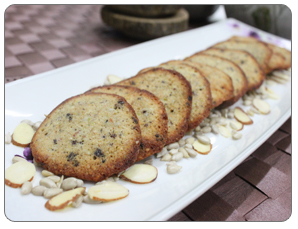 호두 10g, 아몬드 10g, 피스타치오 10g, 땅콩 10g, 해바라기씨 10g, 건블루베리 5g, 달걀흰자 38g, 황설탕 30g, 박력분 11g |