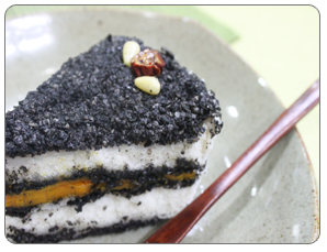 4. 시루(찜기)에 밑받침을 깔고 검은깨 1/4분량을 뿌리고 쌀가루 1/2분량을 뿌린다. 또 그 위에 검은깨 1/4분량을 뿌린 후 설탕에 절인 단호박을 넣는다. 검은깨 1/4분량을 뿌리고 쌀가루 나머지 분량을 넣고 그 위에 나머지 검은깨를 뿌린다.