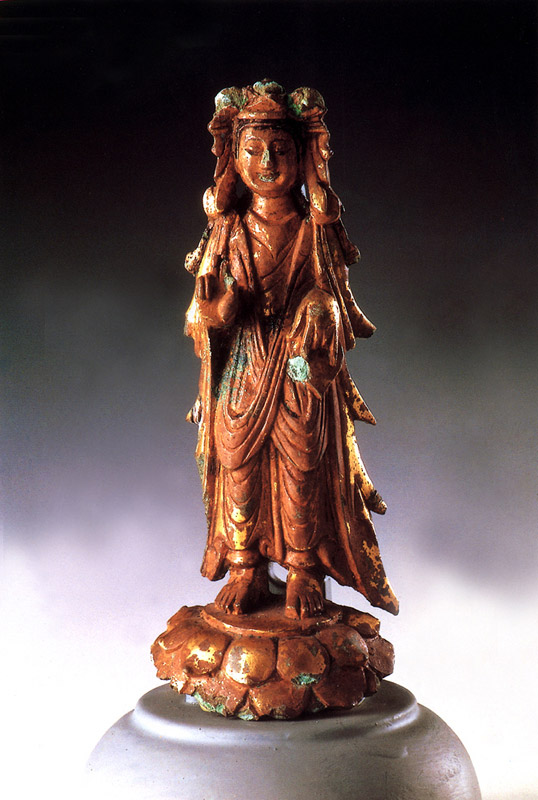 머리에는 화려하게 장식된 관(冠)을 쓰고 있고, 얼굴 좌우로 두꺼운 머리카락이 어깨까지 길게 늘어져 있다. 얼굴은 둥글고 원만하며, 깊이 있는 내면의 웃음이 사실적으로 표현되어 백제인의 부드러움을 느낄 수 있다. 신체는 두꺼운 옷에 싸여 있으나 비교적 양감이 있고 당당한 모습이다. 배에서 X자형으로 교차되는 옷은 발목 부분까지 길게 늘어져 새의 날개깃처럼 양쪽으로 퍼진 모습이며, 발목까지 내려온 또다른 옷자락에는 U자형의 주름이 표현되어있다. 오른손은 네번째 손가락과 새끼 손가락을 구부린 채 위로 향하고 있고 왼손은 손등을 보이면서 아래로 내리고 있다.